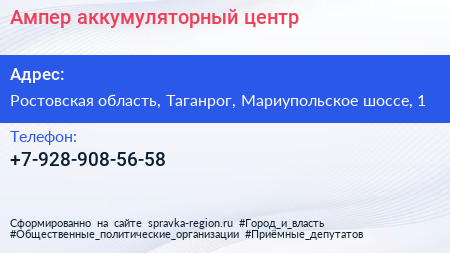 Ампер, аккумуляторный центр по адресу Ростовская область, Таганрог, Мариупольское шоссе, 1 в дальнейшем Организация, размещена в следующих категориях: