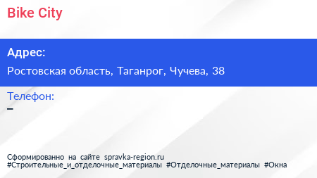 Bike City по адресу Ростовская область, Таганрог, Чучева, 38 в дальнейшем Организация, размещена в следующих категориях: