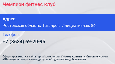 Чемпион, фитнес-клуб по адресу Ростовская область, Таганрог, Инициативная, 86 в дальнейшем Организация, размещена в следующих категориях: