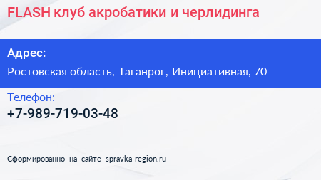 FLASH, клуб акробатики и черлидинга по адресу Ростовская область, Таганрог, Инициативная, 70 в дальнейшем Организация, размещена в следующих категориях: