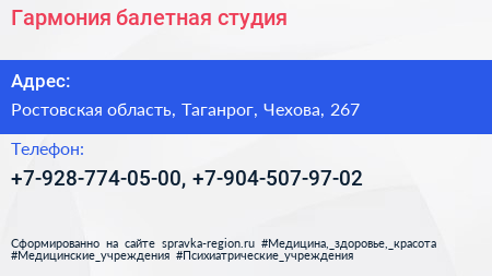 Гармония, балетная студия по адресу Ростовская область, Таганрог, Чехова, 267 в дальнейшем Организация, размещена в следующих категориях: