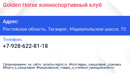 Golden Horse, конноспортивный клуб по адресу Ростовская область, Таганрог, Мариупольское шоссе, 73 в дальнейшем Организация, размещена в следующих категориях:
