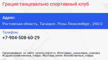 Грация, танцевально-спортивный клуб по адресу Ростовская область, Таганрог, Розы Люксембург, 240/2 в дальнейшем Организация, размещена в следующих категориях: