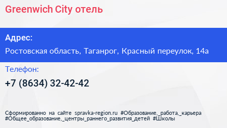 Greenwich City, отель по адресу Ростовская область, Таганрог, Красный переулок, 14а в дальнейшем Организация, размещена в следующих категориях: