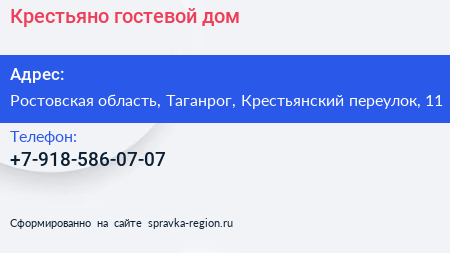 Крестьяно, гостевой дом по адресу Ростовская область, Таганрог, Крестьянский переулок, 11 в дальнейшем Организация, размещена в следующих категориях: