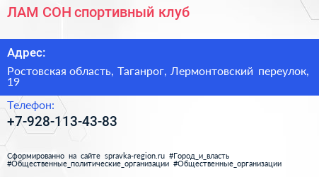ЛАМ-СОН, спортивный клуб по адресу Ростовская область, Таганрог, Лермонтовский переулок, 19 в дальнейшем Организация, размещена в следующих категориях: