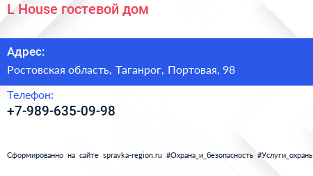 L`House, гостевой дом по адресу Ростовская область, Таганрог, Портовая, 98 в дальнейшем Организация, размещена в следующих категориях:
