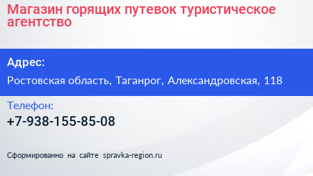 Магазин горящих путевок, туристическое агентство по адресу Ростовская область, Таганрог, Александровская, 118 в дальнейшем Организация, размещена в следующих категориях: