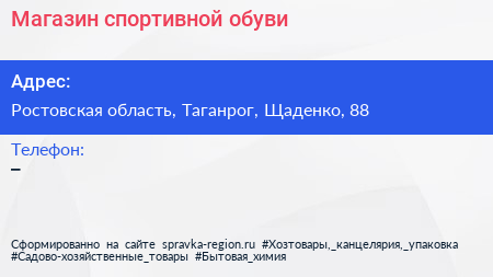 Магазин спортивной обуви по адресу Ростовская область, Таганрог, Щаденко, 88 в дальнейшем Организация, размещена в следующих категориях: