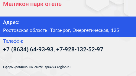 Маликон, парк-отель по адресу Ростовская область, Таганрог, Энергетическая, 125 в дальнейшем Организация, размещена в следующих категориях: