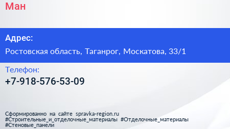Ман по адресу Ростовская область, Таганрог, Москатова, 33/1 в дальнейшем Организация, размещена в следующих категориях: