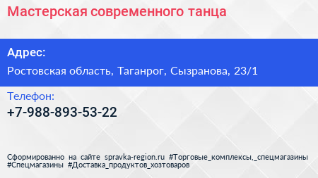 Мастерская современного танца по адресу Ростовская область, Таганрог, Сызранова, 23/1 в дальнейшем Организация, размещена в следующих категориях: