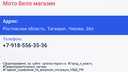 Мото-Вело, магазин по адресу Ростовская область, Таганрог, Чехова, 26л в дальнейшем Организация, размещена в следующих категориях: