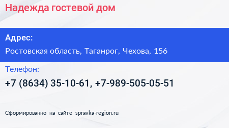 Надежда, гостевой дом по адресу Ростовская область, Таганрог, Чехова, 156 в дальнейшем Организация, размещена в следующих категориях: