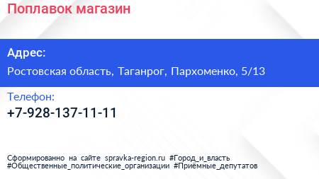 Поплавок, магазин по адресу Ростовская область, Таганрог, Пархоменко, 5/13 в дальнейшем Организация, размещена в следующих категориях: