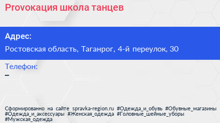 Provокация, школа танцев по адресу Ростовская область, Таганрог, 4-й переулок, 30 в дальнейшем Организация, размещена в следующих категориях: