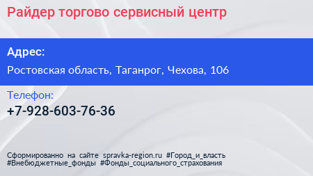 Райдер, торгово-сервисный центр по адресу Ростовская область, Таганрог, Чехова, 106 в дальнейшем Организация, размещена в следующих категориях: