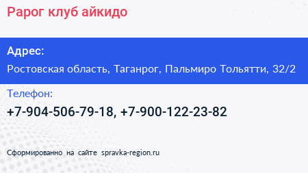 Рарог, клуб айкидо по адресу Ростовская область, Таганрог, Пальмиро Тольятти, 32/2 в дальнейшем Организация, размещена в следующих категориях: