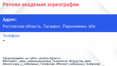 Релеве, академия хореографии по адресу Ростовская область, Таганрог, Пархоменко, 60а в дальнейшем Организация, размещена в следующих категориях: