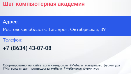 Шаг, компьютерная академия по адресу Ростовская область, Таганрог, Октябрьская, 39 в дальнейшем Организация, размещена в следующих категориях: