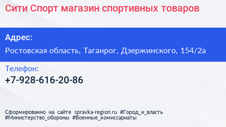 Сити Спорт, магазин спортивных товаров по адресу Ростовская область, Таганрог, Дзержинского, 154/2а в дальнейшем Организация, размещена в следующих категориях: