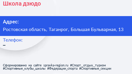 Школа дзюдо по адресу Ростовская область, Таганрог, Большая Бульварная, 13 в дальнейшем Организация, размещена в следующих категориях: