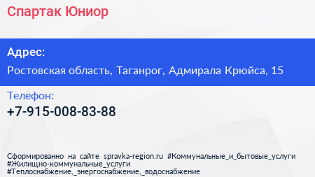 Спартак Юниор по адресу Ростовская область, Таганрог, Адмирала Крюйса, 15 в дальнейшем Организация, размещена в следующих категориях: