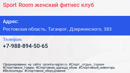 Sport Room, женский фитнес-клуб по адресу Ростовская область, Таганрог, Дзержинского, 183 в дальнейшем Организация, размещена в следующих категориях:
