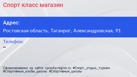Спорт класс, магазин по адресу Ростовская область, Таганрог, Александровская, 91 в дальнейшем Организация, размещена в следующих категориях: