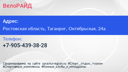 ВелоРАЙД по адресу Ростовская область, Таганрог, Октябрьская, 24а в дальнейшем Организация, размещена в следующих категориях: