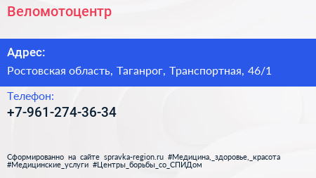 Веломотоцентр по адресу Ростовская область, Таганрог, Транспортная, 46/1 в дальнейшем Организация, размещена в следующих категориях: