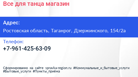 Все для танца, магазин по адресу Ростовская область, Таганрог, Дзержинского, 154/2а в дальнейшем Организация, размещена в следующих категориях: