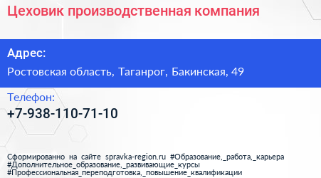 Цеховик, производственная компания по адресу Ростовская область, Таганрог, Бакинская, 49 в дальнейшем Организация, размещена в следующих категориях: