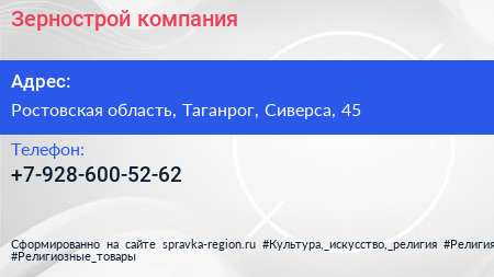 Зернострой, компания по адресу Ростовская область, Таганрог, Сиверса, 45 в дальнейшем Организация, размещена в следующих категориях: