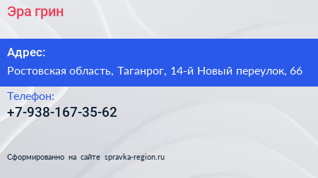 Эра-грин по адресу Ростовская область, Таганрог, 14-й Новый переулок, 66 в дальнейшем Организация, размещена в следующих категориях: