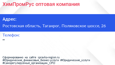 ХимПромРус, оптовая компания по адресу Ростовская область, Таганрог, Поляковское шоссе, 26 в дальнейшем Организация, размещена в следующих категориях: