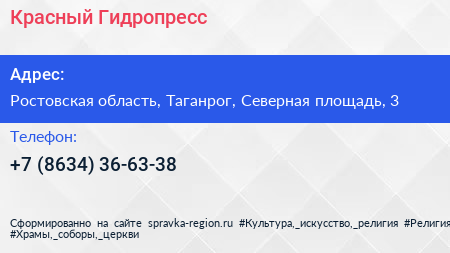 Красный Гидропресс по адресу Ростовская область, Таганрог, Северная площадь, 3 в дальнейшем Организация, размещена в следующих категориях: