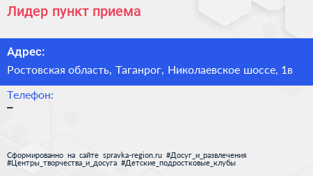 Лидер, пункт приема по адресу Ростовская область, Таганрог, Николаевское шоссе, 1в в дальнейшем Организация, размещена в следующих категориях: