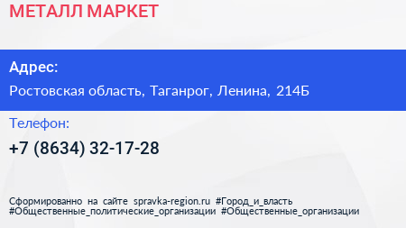 МЕТАЛЛ-МАРКЕТ по адресу Ростовская область, Таганрог, Ленина, 214Б в дальнейшем Организация, размещена в следующих категориях: