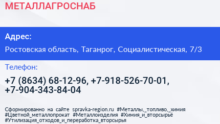 МЕТАЛЛАГРОСНАБ по адресу Ростовская область, Таганрог, Социалистическая, 7/3 в дальнейшем Организация, размещена в следующих категориях: