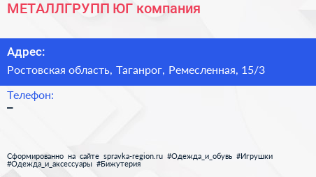 МЕТАЛЛГРУПП-ЮГ, компания по адресу Ростовская область, Таганрог, Ремесленная, 15/3 в дальнейшем Организация, размещена в следующих категориях: