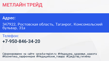 МЕТЛАЙН ТРЕЙД по адресу 347922, Ростовская область, Таганрог, Комсомольский бульвар, 31а в дальнейшем Организация, размещена в следующих категориях: