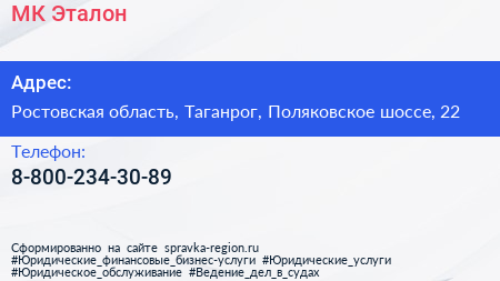 МК-Эталон по адресу Ростовская область, Таганрог, Поляковское шоссе, 22 в дальнейшем Организация, размещена в следующих категориях:
