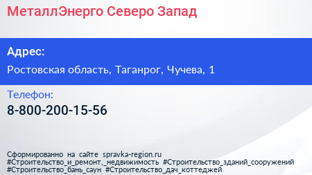МеталлЭнерго Северо-Запад по адресу Ростовская область, Таганрог, Чучева, 1 в дальнейшем Организация, размещена в следующих категориях: