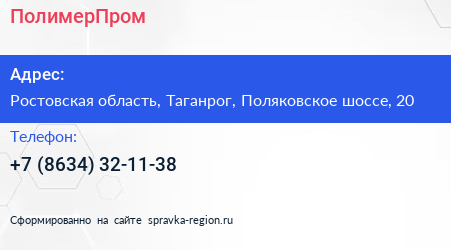 ПолимерПром по адресу Ростовская область, Таганрог, Поляковское шоссе, 20 в дальнейшем Организация, размещена в следующих категориях: