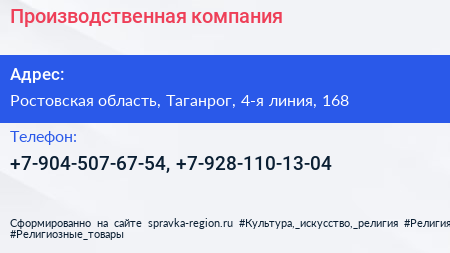 Производственная компания по адресу Ростовская область, Таганрог, 4-я линия, 168 в дальнейшем Организация, размещена в следующих категориях: