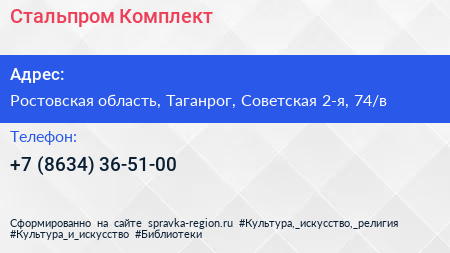 Стальпром-Комплект по адресу Ростовская область, Таганрог, Советская 2-я, 74/в в дальнейшем Организация, размещена в следующих категориях: