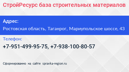 СтройРесурс, база строительных материалов по адресу Ростовская область, Таганрог, Мариупольское шоссе, 43 в дальнейшем Организация, размещена в следующих категориях: