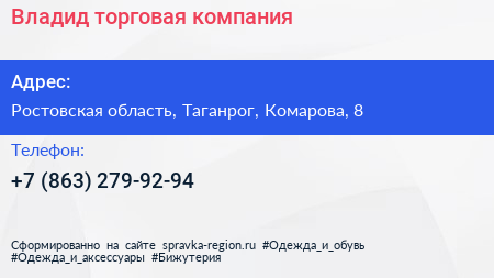 Владид, торговая компания по адресу Ростовская область, Таганрог, Комарова, 8 в дальнейшем Организация, размещена в следующих категориях: