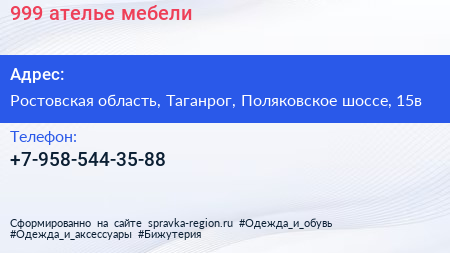 999, ателье мебели по адресу Ростовская область, Таганрог, Поляковское шоссе, 15в в дальнейшем Организация, размещена в следующих категориях: